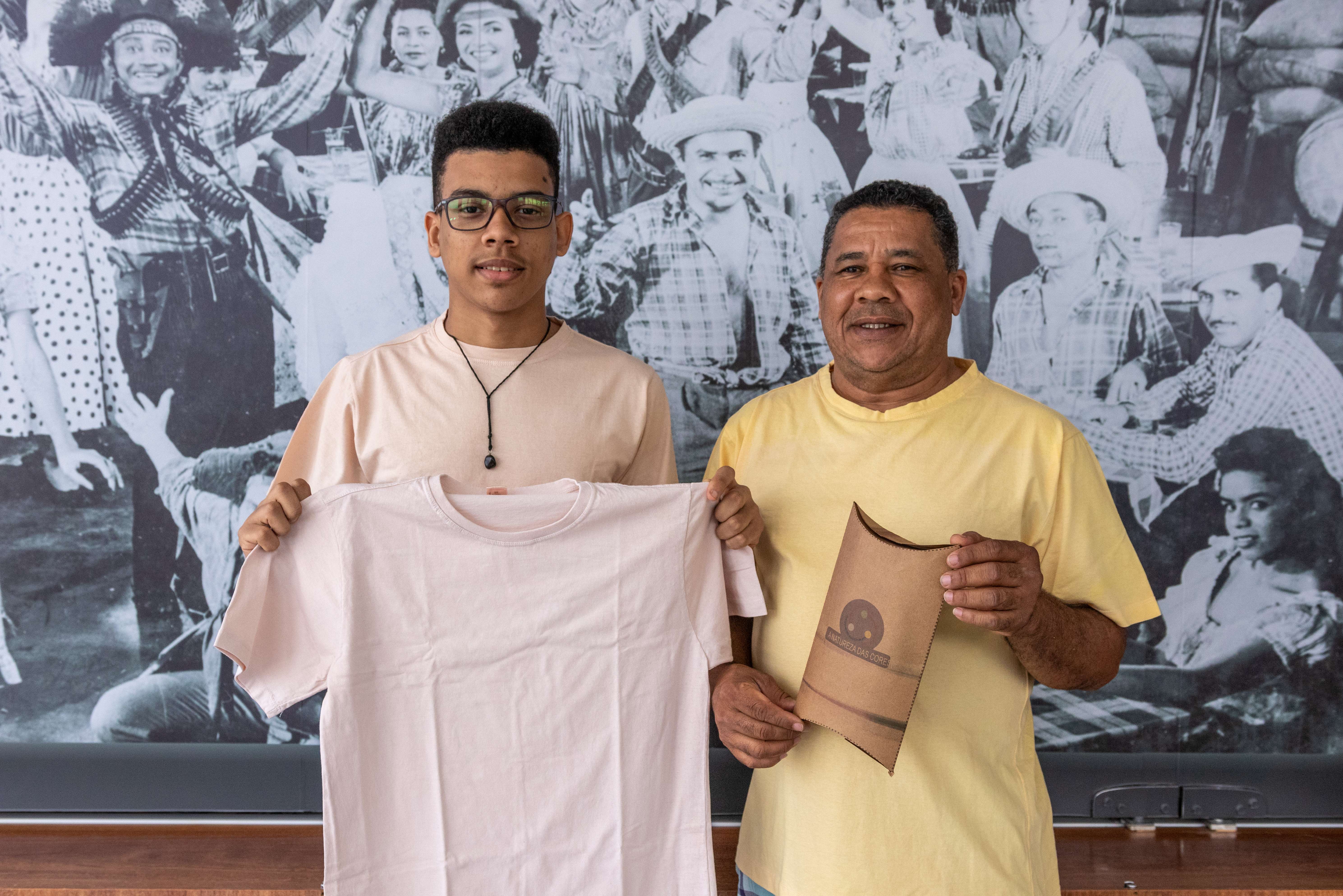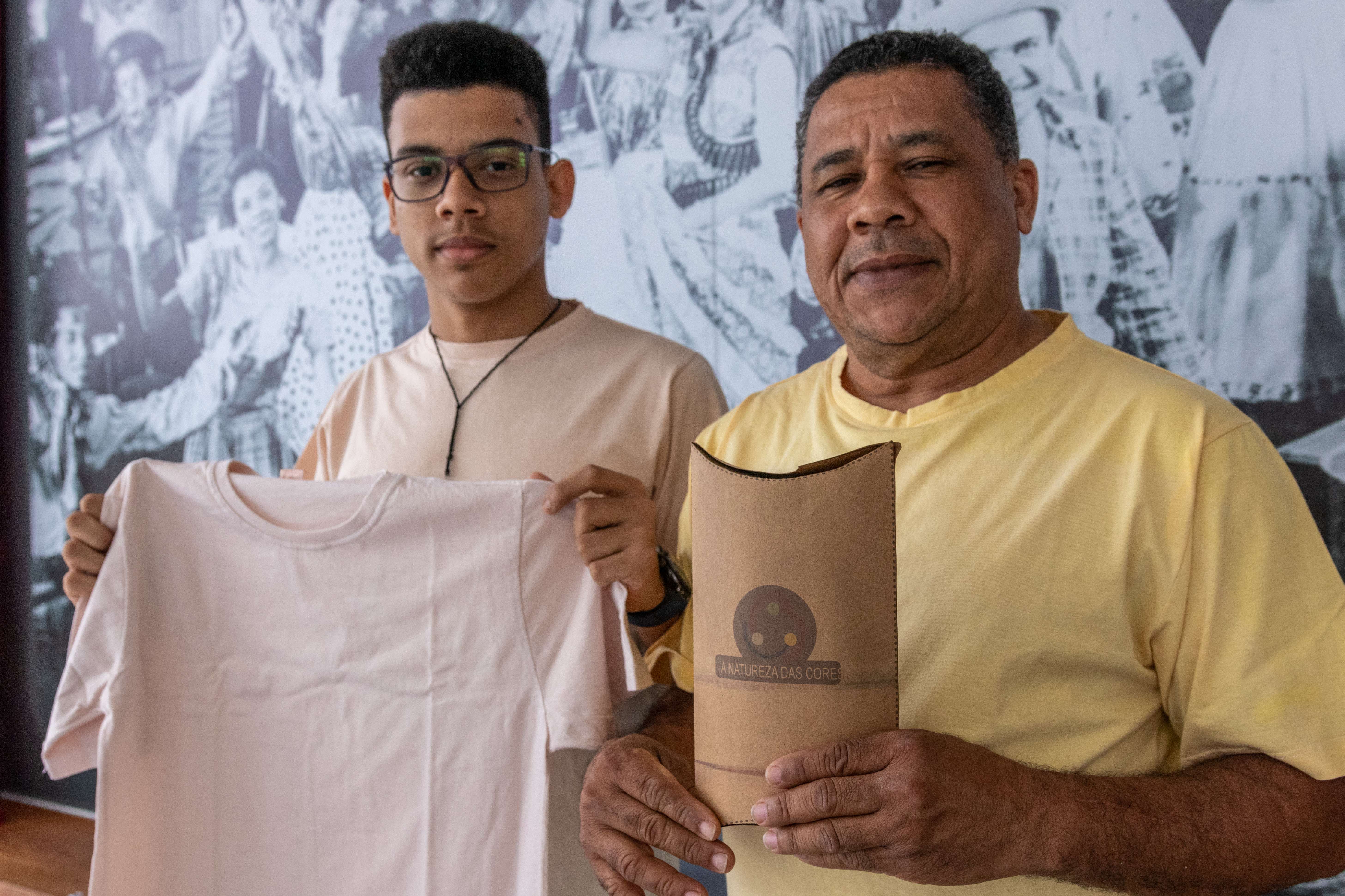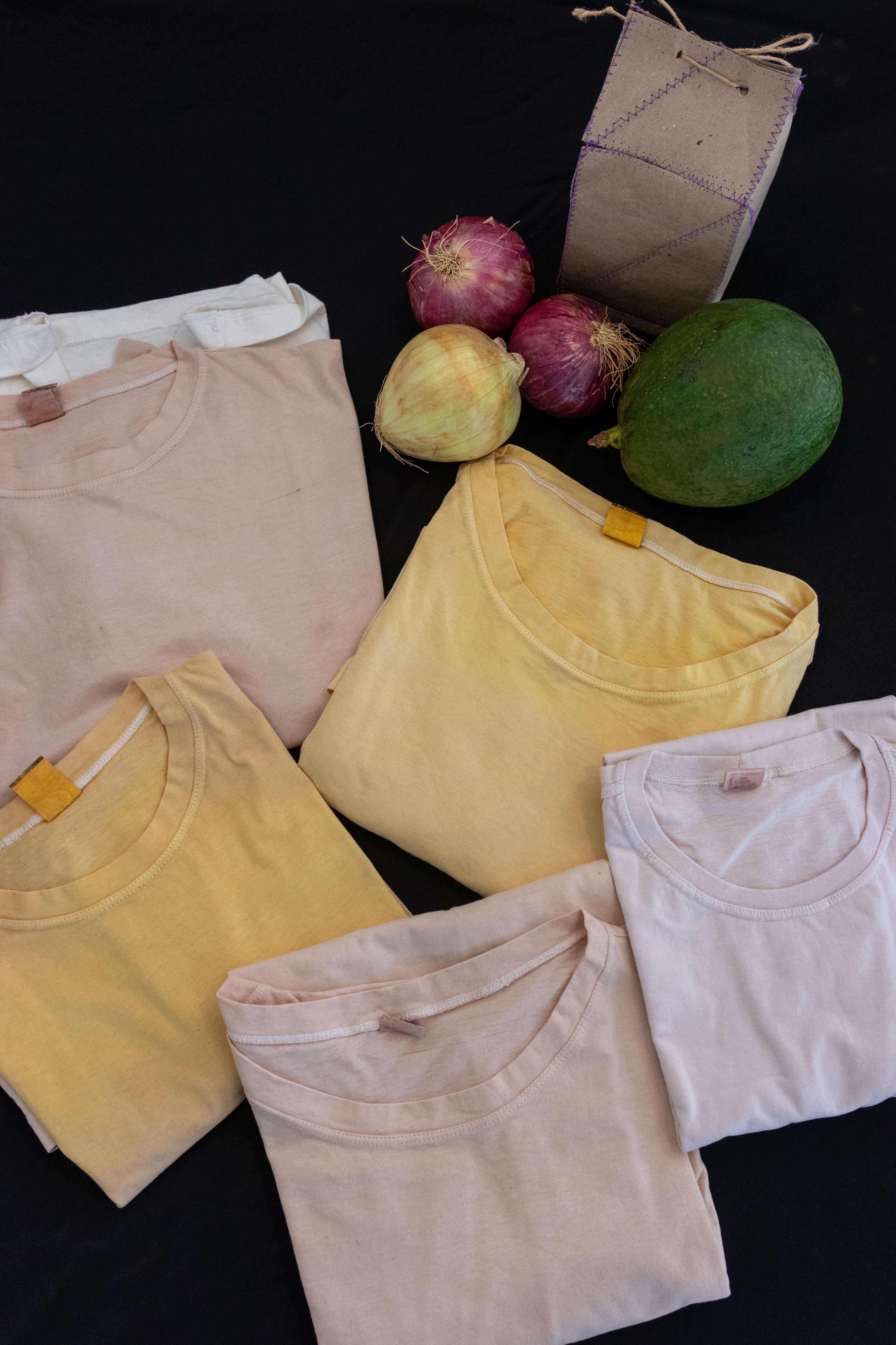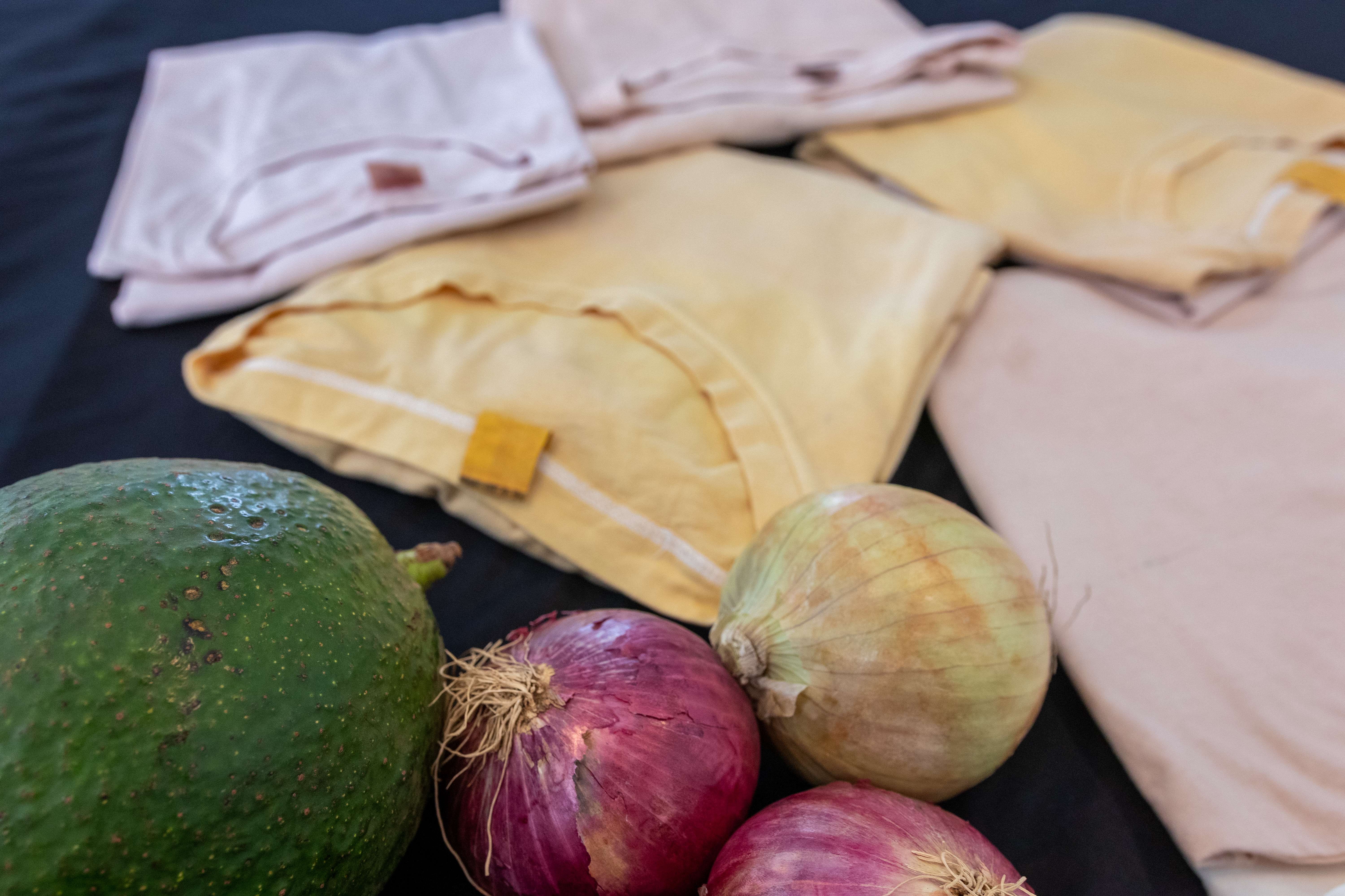 Neste produto, o diferencial é o tingimento natural de tecidos em algodão utilizando urucum e resíduos descartados, como cascas de cebola e caroços de abacate, resultando numa coloração suave e duradoura.