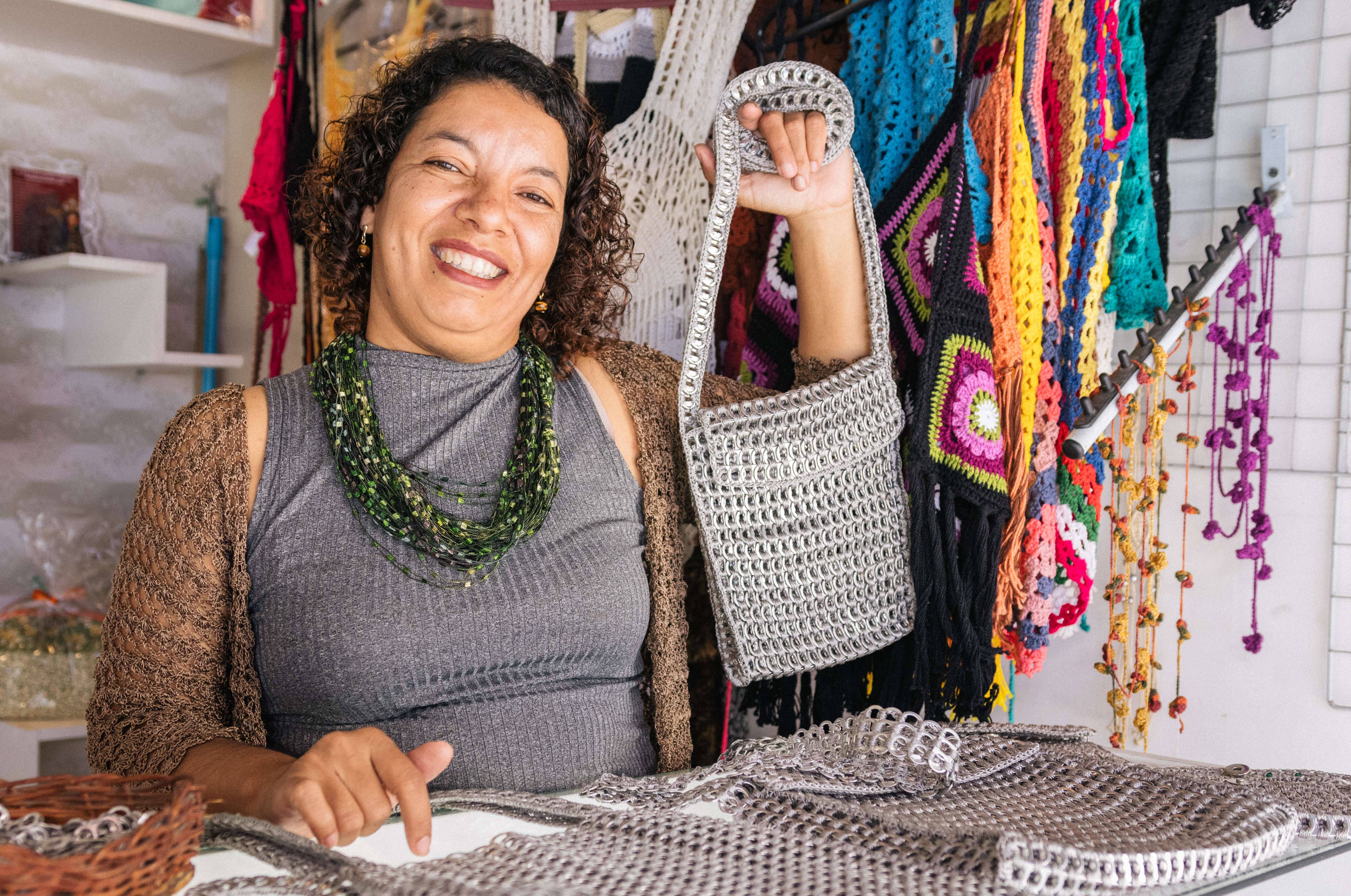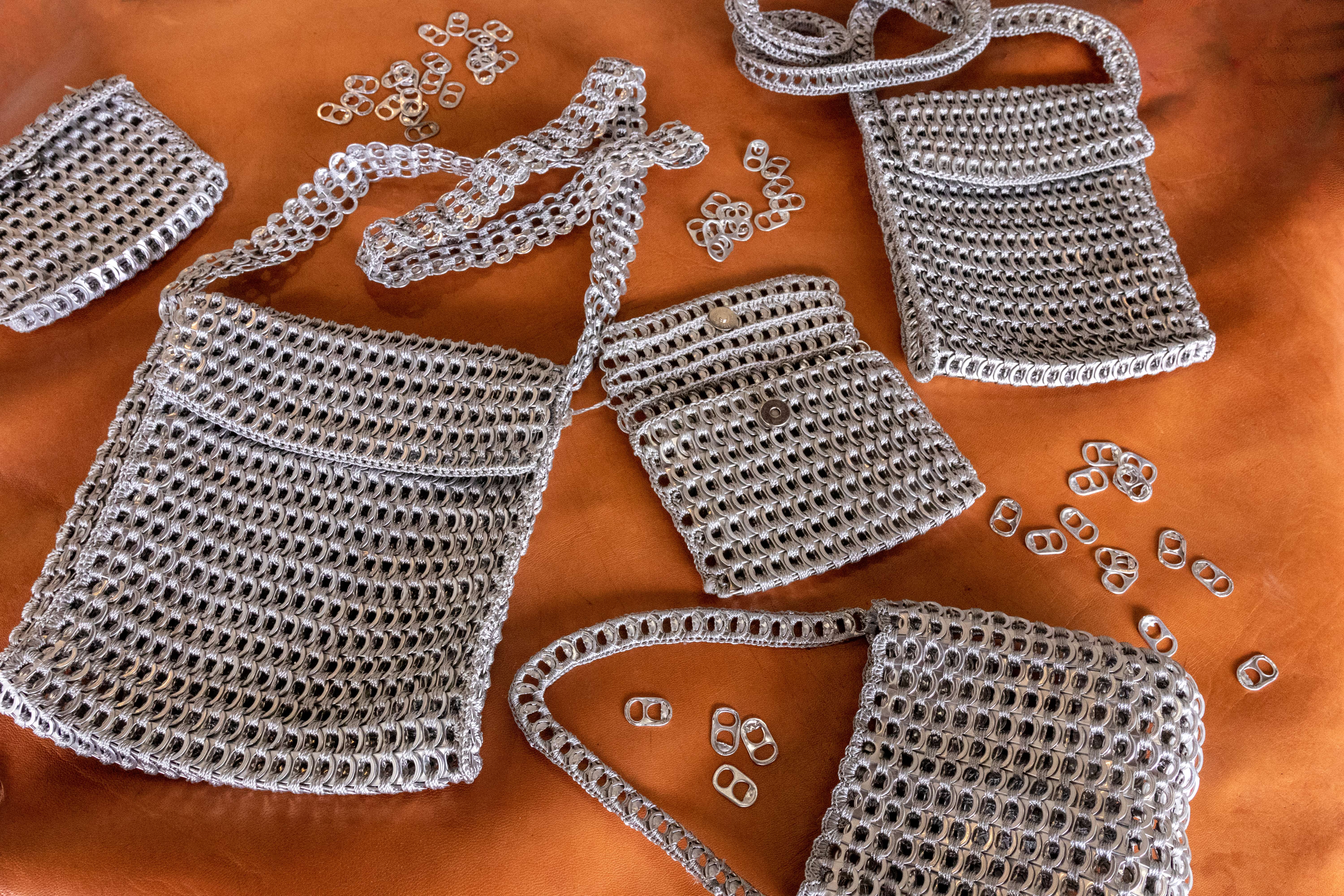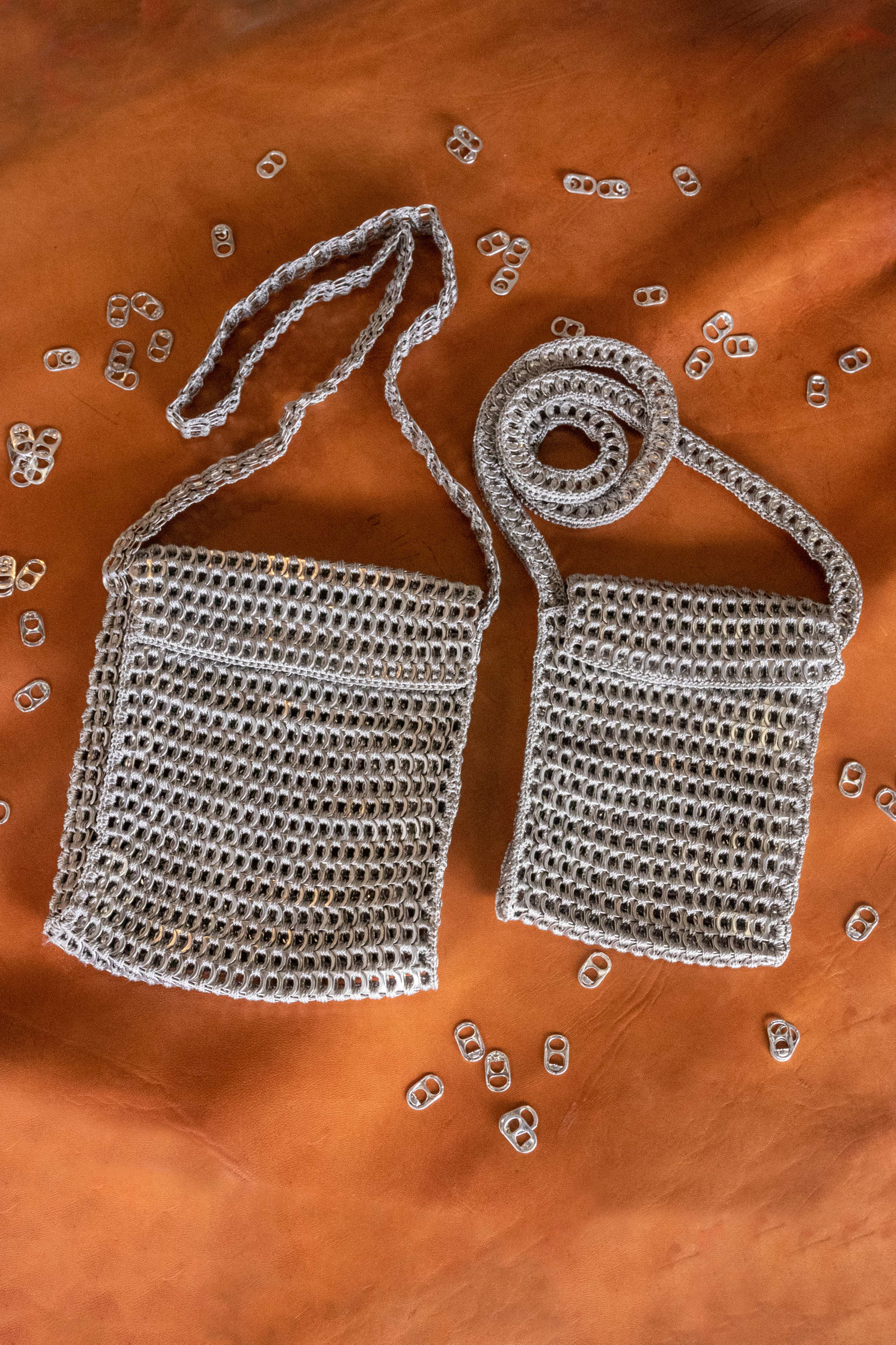 Bolsa retangular com alça longa, para ser usada cruzada, feita artesanalmente com lacres de alumínio, material reciclado e finalizada com crochê. Produto de design exclusivo, com referência na cultura paraibana.